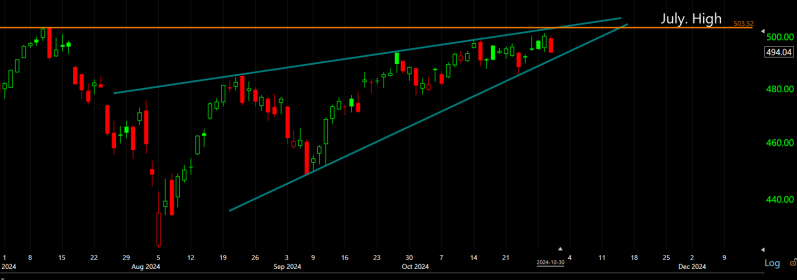 The July high at 503.52 adds further significance to the pattern as a horizontal resistance level. If QQQ fails to break above this level and instead breaks below the wedge support, it would confirm the reversal signal.