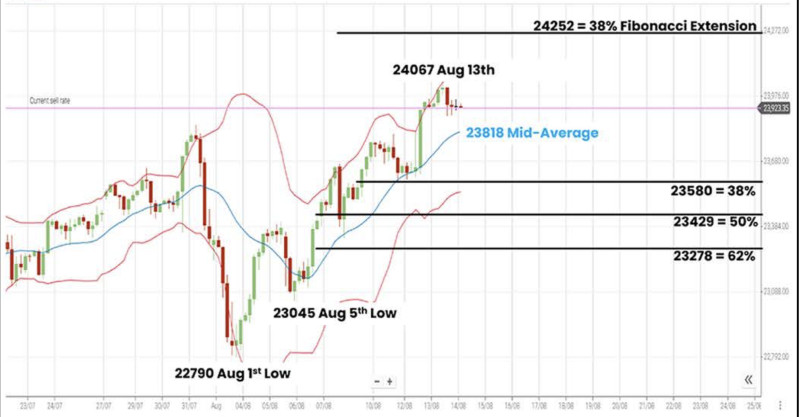 While support at 23818 (Bolinger mid-average) holds any future price weakness the potential is for continued upside strength to test, even break resistance at 24067 (August 13th high), opening moves toward 24252 (38% Fibonacci extension).