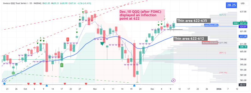 • Breakout: QQQ cleared the “traffic jam” at 622.